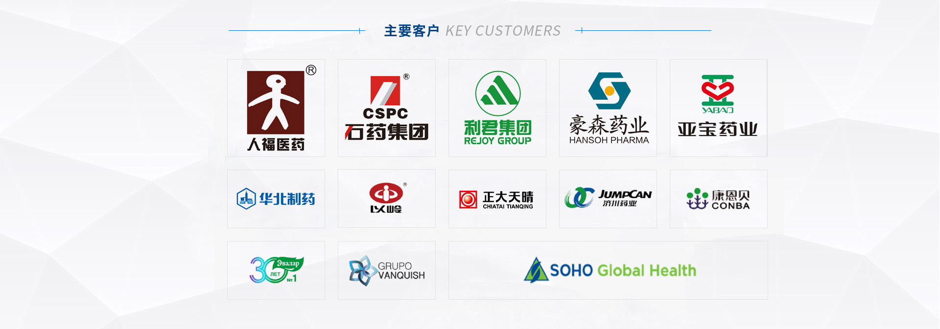 我們的客戶:華藥集團 | 石藥集團 | 九州藥業(yè) | 以嶺藥業(yè) | 正大天晴 |武漢人福 | 西安利君 | 山西亞寶 | 濟川藥業(yè) | 中山達安基因 | 恒升醫(yī)學(xué) | 九州通 | 康恩貝 |四環(huán)藥業(yè) |豪森藥業(yè) | 哈藥集團 | 東北制藥 | 武漢麥鑫利